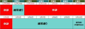 年末年始は12月30日(火曜日)から1月4日(日曜日)まで休診いたします。